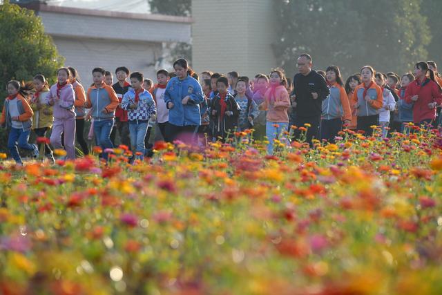 寨下鎮(zhèn)中心小學校長殷大福帶著學生們在花田邊晨練(11月10日攝)。
