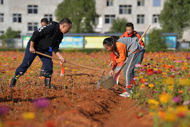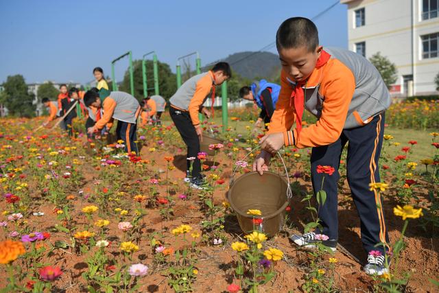 今年暑假剛剛到任江西省宜春市袁州區(qū)寨下鎮(zhèn)中心小學的殷大福校長看著教學樓前一大片長滿雜草的荒地,希望能在上面做點文章,讓孩子們課后有個休閑活動的好去處。于是,他和老師們一起平整荒地,種下百日草的種子,開辟出花田和草坪。如今,昔日的荒地上已綻放出一片絢爛的花海,學生們的學習生活因此更加豐富多彩。美術課、十字繡興趣小組的同學紛紛到花田邊寫生、采風,孩子們在綠地里玩耍訓練。每周,殷大福校長還會組織不同班級的學生下田勞動,為鮮花松土、施肥、澆水,讓他們親身體驗守護生活中美好的滋味。呵護、陪伴、欣賞……一顆顆真善美的種子在學生們的心底悄然種下。