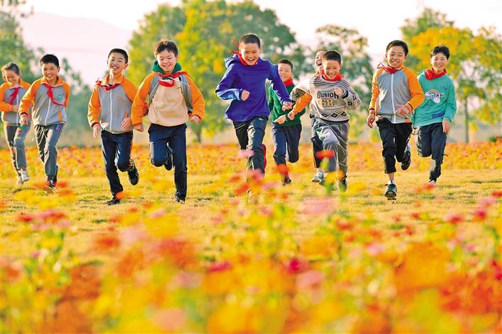 在江西省宜春市袁州區(qū)寨下中心小學(xué),學(xué)生們在花田邊玩耍(11月9日攝)。新華社記者 彭昭之 攝