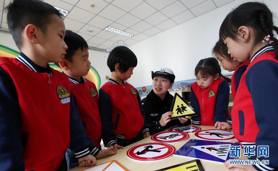 11月30日,交警在位于濟南市的山東省實驗幼兒園南校區(qū)指導(dǎo)孩子們識別交通安全標(biāo)識牌。新華社發(fā)(郝群英 攝)