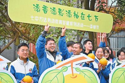 12月4日,成都七中萬達學(xué)校首屆“添柚節(jié)”開幕?!疤龛止?jié)”覆蓋了多個年級,設(shè)置了多項活動,并融入學(xué)科元素,如初一年級結(jié)合生物和美術(shù)學(xué)科,或用柚子做小零食進行義賣,或在柚子上繪出不同的圖案;初二年級則結(jié)合地理和美術(shù)學(xué)科,描繪出一幅幅中國的“水果”地圖;高三年級的學(xué)生摘下柚子與老師一同品嘗豐收的味道。