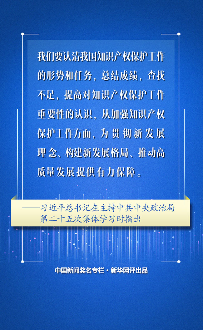 近日,中共中央政治局就加強(qiáng)我國知識(shí)產(chǎn)權(quán)保護(hù)工作舉行第二十五次集體學(xué)習(xí),習(xí)近平總書記在主持學(xué)習(xí)時(shí)發(fā)表重要講話,回顧總結(jié)我國知識(shí)產(chǎn)權(quán)保護(hù)工作取得的歷史性成就,深刻闡述知識(shí)產(chǎn)權(quán)保護(hù)工作的重要性,對全面加強(qiáng)知識(shí)產(chǎn)權(quán)保護(hù)工作提供了明確思路和行動(dòng)指南。