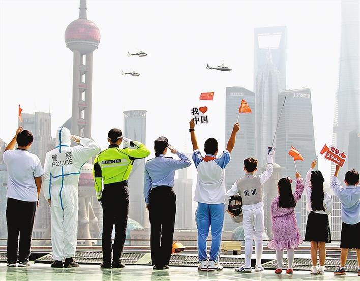 10月1日,警用直升機(jī)懸掛著五星紅旗飛過(guò)上海黃浦江上空。新華社記者 陳飛 攝