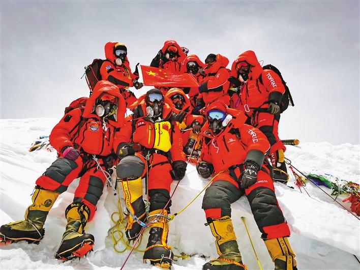 5月27日,2020珠峰高程測(cè)量登山隊(duì)成功登頂世界第一高峰珠穆朗瑪峰。他們?cè)诜屙斬Q立覘標(biāo),安裝GNSS天線,開展各項(xiàng)峰頂測(cè)量工作。45年前的這一天,中國(guó)人首次將覘標(biāo)帶至珠峰峰頂。新華社特約記者 扎西次仁 攝