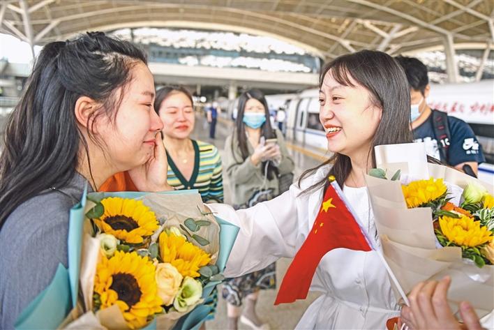 10月1日,一批馳援過(guò)武漢抗疫的江蘇醫(yī)療隊(duì)隊(duì)員重回武漢,曾經(jīng)并肩戰(zhàn)斗的江蘇援鄂醫(yī)療隊(duì)員吳衛(wèi)娟(右)和武漢市江夏中醫(yī)院的董璇(左)再度相逢,喜極而泣。新華社記者 程敏 攝