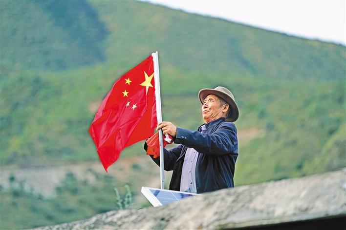 9月25日,在西藏昌都市江達(dá)縣崗?fù)写澹瞻驮谖蓓斏蠐Q上嶄新的國(guó)旗,這是他每月進(jìn)行一次的“儀式”。今年是昌都解放70周年,普巴說(shuō),現(xiàn)在我們的美好日子,是解放軍用生命和鮮血換來(lái)的,這份恩情,我們不會(huì)忘記。新華社記者 詹彥 攝