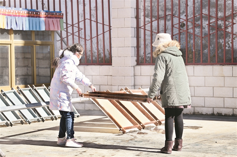 圖為學(xué)生在老師指導(dǎo)下,體驗(yàn)雪拉藏紙的制作過(guò)程。貢嘎來(lái)松攝
