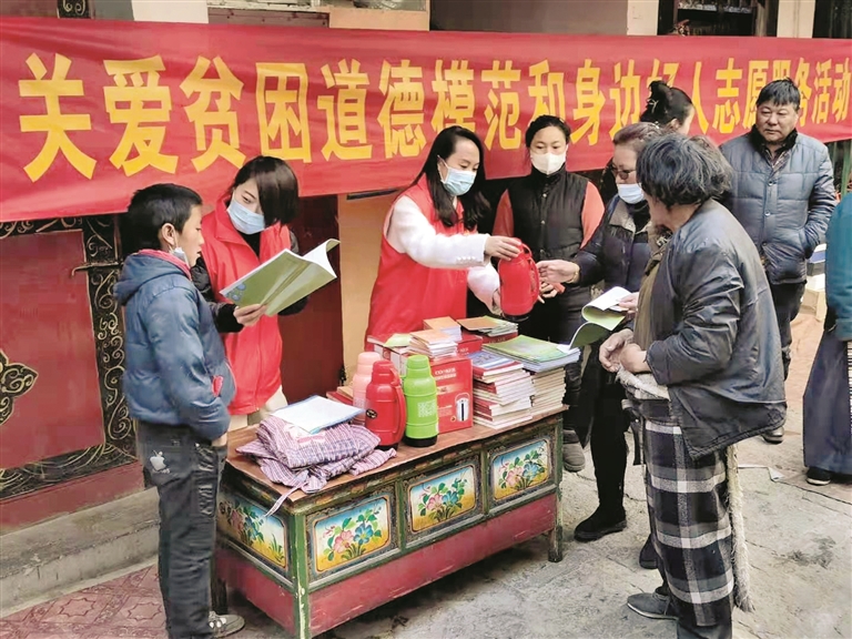 在社區(qū)大院,志愿者們身穿紅馬甲,各自分工,一邊幫助社區(qū)群眾打掃衛(wèi)生,一邊發(fā)放慰問物資和宣傳手冊(cè),向大家宣講黨的政策法規(guī)、普及疫情防控相關(guān)知識(shí),將文明城市創(chuàng)建的理念植根于社區(qū)群眾心中。來到道德模范卓瑪央宗家里,志愿者們和老人談心談話,拉家常、說變化,了解老人的生活情況和身體狀況,囑咐老人要保持心情愉悅,安享晚年幸福生活。