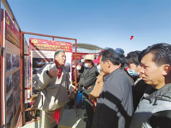 圖為在桑珠孜區(qū)甲措雄鄉(xiāng)文化廣場,宣講員結(jié)合展板圖文內(nèi)容開展黨史學(xué)習教育宣講。汪純 攝