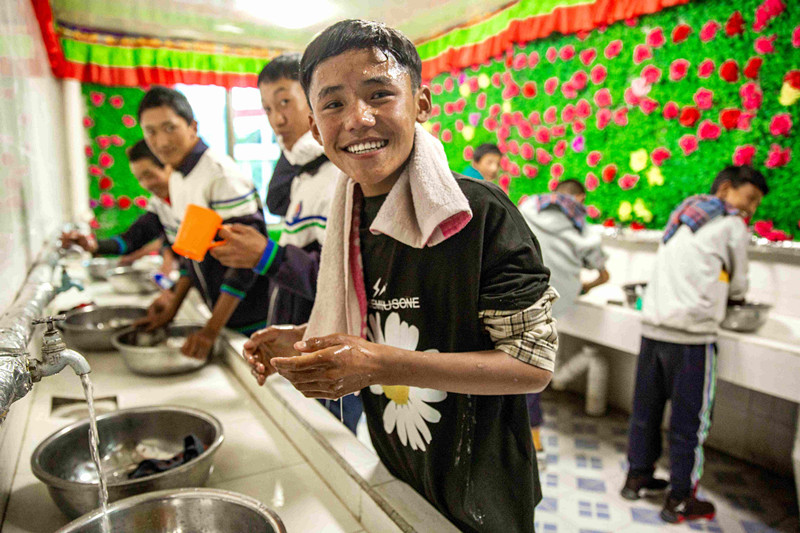 走進(jìn)薩迦中學(xué)新投入使用的女生宿舍樓,可以看到每個(gè)房間門口都布置了信息欄,詳細(xì)介紹了入住學(xué)生信息、室長(zhǎng)和帶教老師信息;門口統(tǒng)一配備鞋架,孩子們?cè)陂T口換好鞋再進(jìn)房間,保持了室內(nèi)地面的清潔。室內(nèi)外隔間是統(tǒng)一的儲(chǔ)物柜,存放學(xué)生私人用品;內(nèi)間是整整齊齊8個(gè)上下鋪位,中間合用的臺(tái)子上牙刷、水杯整齊劃一擺放;靠窗有統(tǒng)一的臉盆架;每個(gè)樓層都有3處盥洗室。由于縣中學(xué)內(nèi)沒有學(xué)生浴室,新宿舍盥洗室內(nèi)還特地安裝了電加熱的恒溫暖水設(shè)備。入冬后,薩迦中學(xué)的孩子們終于能夠在宿舍洗漱時(shí)用上熱水了。