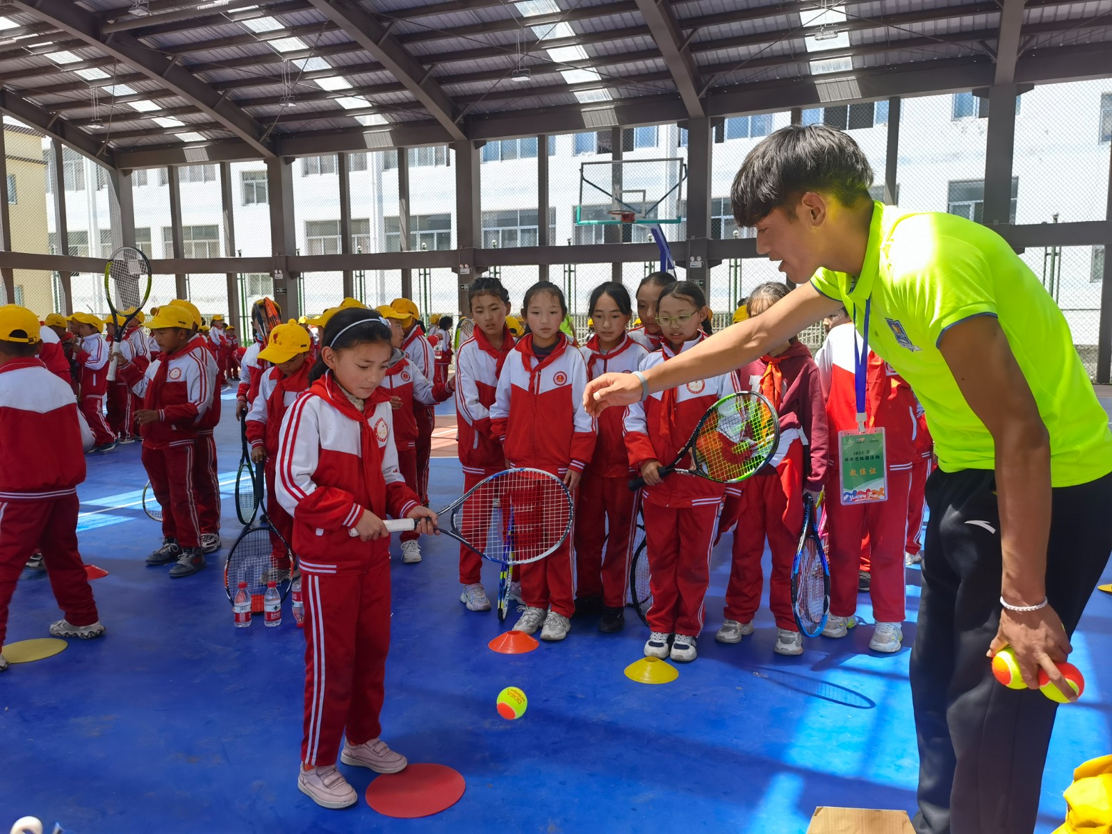 圖為西藏自治區(qū)網(wǎng)球協(xié)會向?qū)W校師生捐贈網(wǎng)球裝備