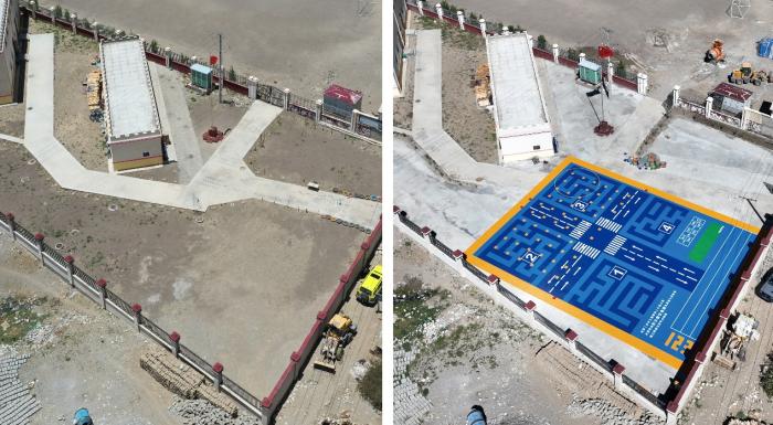 扎西宗鄉(xiāng)完全附屬小學(xué)幼兒園操場建設(shè)前后航拍對(duì)比圖