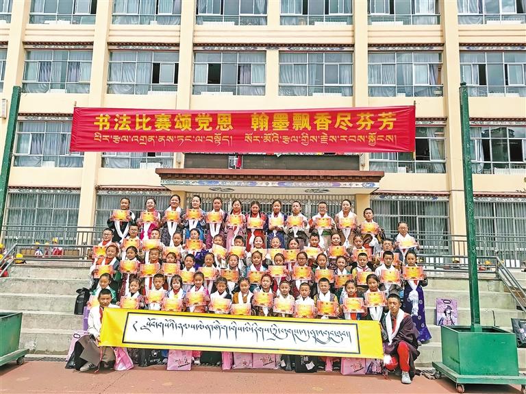 “我們學(xué)校組織過(guò)幾次書(shū)法比賽,還選取了一些較好的作品裝訂成書(shū),發(fā)放到每個(gè)班級(jí)供學(xué)生們參考。這樣一來(lái),很多學(xué)生在書(shū)上看到別人的照片和書(shū)法作品時(shí),能夠激發(fā)他們對(duì)書(shū)法的興趣和書(shū)寫(xiě)的積極性。現(xiàn)在,參賽的學(xué)生越來(lái)越多了。”娘熱小學(xué)副校長(zhǎng)拉巴介紹,在教育改革以及學(xué)校“雙減”工作和課后服務(wù)的背景下,娘熱小學(xué)積極探索,結(jié)合本校實(shí)際情況,開(kāi)設(shè)了藏戲、藏文書(shū)法、校園足球等三大特色板塊。2019年,拉薩市文聯(lián)、曲藝家協(xié)會(huì)以及書(shū)法家協(xié)會(huì)分別授予娘熱小學(xué)曲藝、舞蹈、藝術(shù)教育培訓(xùn)基地和書(shū)法教育培訓(xùn)基地稱(chēng)號(hào),極大提高了師生的學(xué)習(xí)積極性。