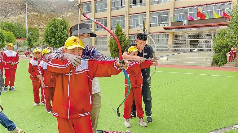 曲水縣達(dá)嘎鎮(zhèn)小學(xué)學(xué)生在體驗(yàn)民族傳統(tǒng)體育項(xiàng)目響箭。