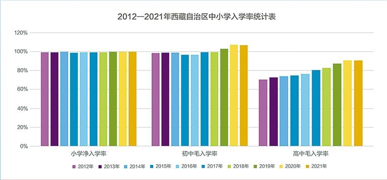 教育事業(yè)成果豐碩。全區(qū)共有各級各類學(xué)校3339所,在校學(xué)生92萬人。圖為西藏自治區(qū)中小學(xué)入學(xué)率統(tǒng)計表。