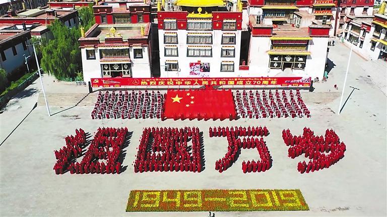 引導(dǎo)宗教界人士爭(zhēng)做愛黨愛國愛人民、堅(jiān)決維護(hù)祖國統(tǒng)一和民族團(tuán)結(jié)的模范。圖為2019年10月1日,西藏自治區(qū)昌都強(qiáng)巴林寺僧人以自己的方式表達(dá)對(duì)中華人民共和國成立70周年的祝福。