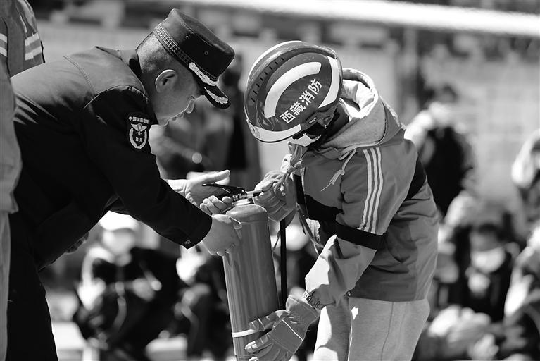 圖為消防知識進校園活動中,消防員手把手教學(xué)生學(xué)習(xí)使用滅火器。(圖片由山南市消防救援支隊提供)
