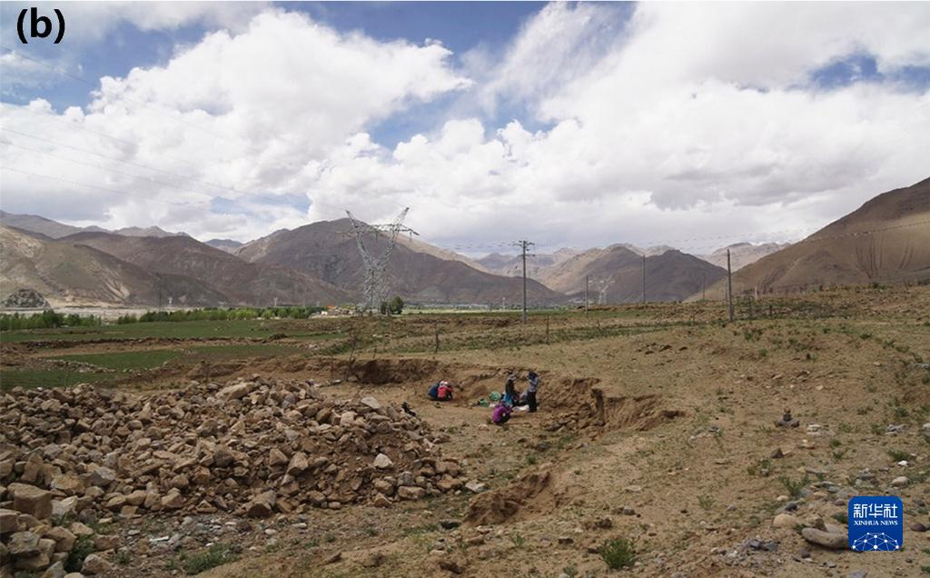 圖(b)為科考隊(duì)員發(fā)現(xiàn)共塘遺址后隨即進(jìn)行地層剖面清理和樣品采集。(資料圖片由第二次青藏科考隊(duì)“人類活動(dòng)歷史及其影響”分隊(duì)提供)