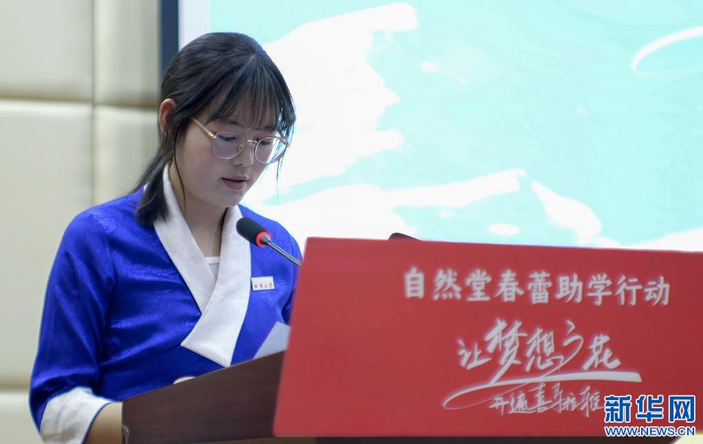 受資助大學(xué)生代表德慶旺姆正在發(fā)言(2023年5月8日 攝)。新華社記者 旦增尼瑪曲珠 攝