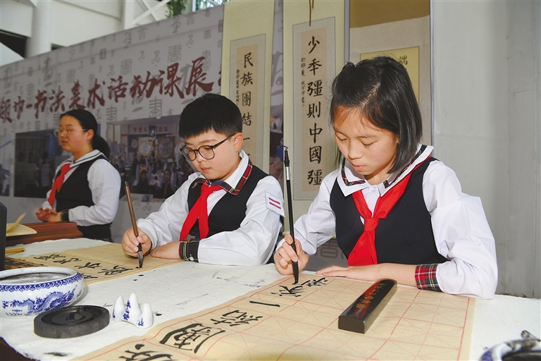 拉薩市實(shí)驗(yàn)小學(xué)學(xué)生書寫書法作品。記者 李洲 攝