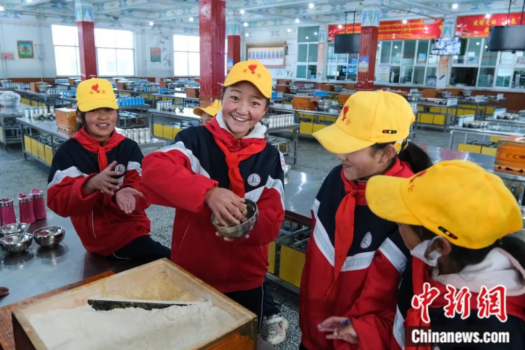 西藏班戈縣中石化小學(xué)學(xué)生在學(xué)校食堂捏糌粑。江飛波 攝