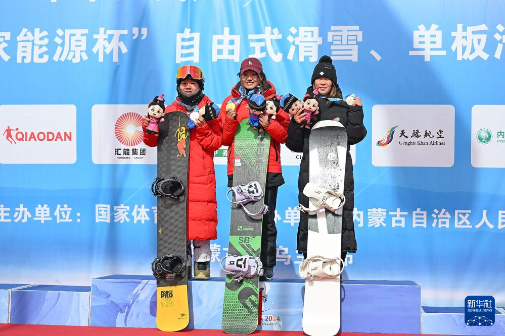 2月19日,在第十四屆全國(guó)冬季運(yùn)動(dòng)會(huì)單板滑雪青年組女子障礙追逐比賽中,西藏隊(duì)選手擁青拉姆、湖北隊(duì)選手楊禮妍和遼寧隊(duì)選手馮賀分獲前三名。新華社記者 李志鵬 攝