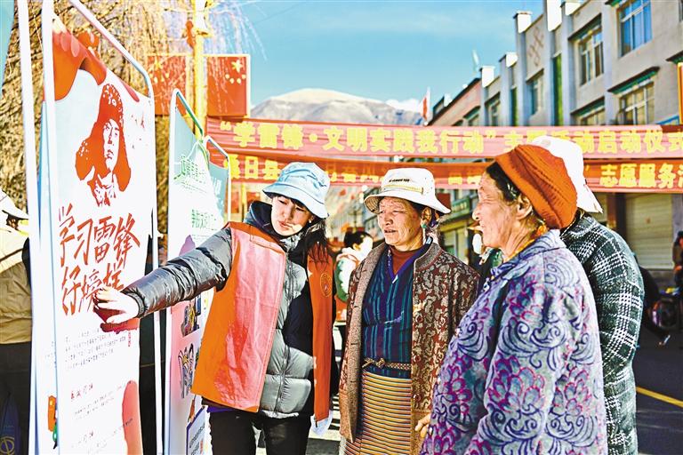 圖為在桑日縣“學雷鋒·文明實踐我行動”主題活動啟動儀式現(xiàn)場,志愿者向過往群眾講解雷鋒精神。記者 丹增平措 攝
