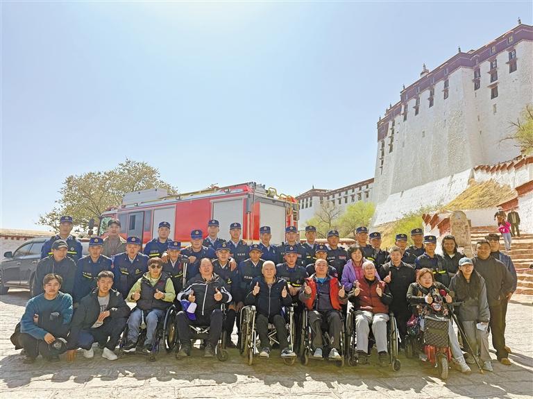 “圓夢”之旅結(jié)束后,殘障游客與消防指戰(zhàn)員在布達(dá)拉宮腳下合影。
