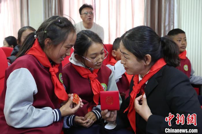 圖為單增卓嘎正在為學生們展示和講解莊嚴的法徽。倫珠澤仁攝