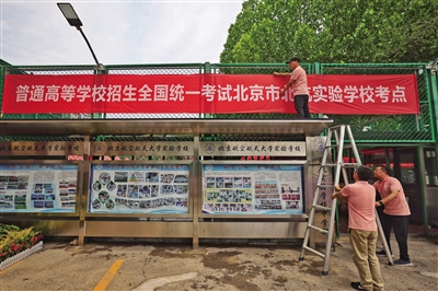 6月6日,記者在北京航空航天大學(xué)實(shí)驗(yàn)學(xué)校中學(xué)部(簡(jiǎn)稱“北航實(shí)驗(yàn)學(xué)?!保┛键c(diǎn)看到,學(xué)校西門處已懸掛起高考考點(diǎn)橫幅、考場(chǎng)布置已就位,校園內(nèi)放置了多個(gè)溫馨的提示語(yǔ)標(biāo)牌。據(jù)悉,該校是今年新增高考考點(diǎn)之一,承接來(lái)自9所學(xué)校277名考生的高考組考任務(wù)。此外,記者還探訪了北京高考人大附中經(jīng)開學(xué)??键c(diǎn)