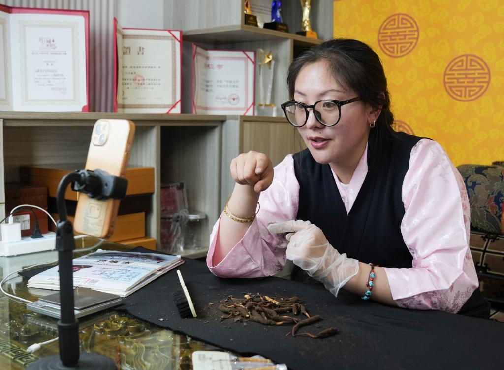 在夢譽蟲草產(chǎn)業(yè)帶直播基地,羅拉的妻子次仁白吉在直播帶貨(5月31日攝)。新華社記者丁汀 攝