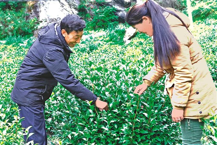 圖為勒門巴民族鄉(xiāng)茶葉農(nóng)牧民專業(yè)合作社理事長(zhǎng)羅布次仁(左)和技術(shù)指導(dǎo)達(dá)娃卓瑪在查看茶葉長(zhǎng)勢(shì)。 記者 段敏 攝
