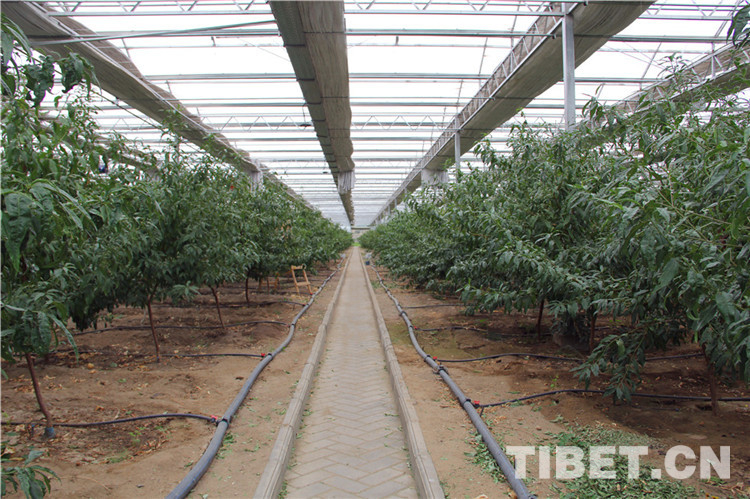 在高原上栽好一棵桃樹需要傾注更多的心血。經(jīng)過(guò)大棚的中控室,王榮華說(shuō):“這里晝夜溫差大、紫外線強(qiáng),冬天的時(shí)候還要澆凍水、拉膜蓋土、給樹打防凍液,在高原發(fā)展果樹種植困難不少。不同于內(nèi)地的桃樹,在這里快4年了,露天的桃樹只長(zhǎng)高兩三米?!闭f(shuō)到這里,他不由感慨科技種植的力量:“大棚里的桃樹一年就長(zhǎng)到3米多高,并且掛果了?;叵?017年時(shí),露天種下的桃樹只有手指粗細(xì),如今長(zhǎng)勢(shì)這么好,真有點(diǎn)不可思議?!?/p>