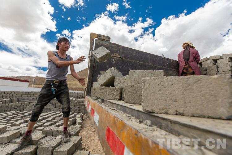 圖為山南市隆子縣日當(dāng)鎮(zhèn)加洛村村民桑珠的女婿平措(圖左)在磚廠運(yùn)磚 攝影:趙耀