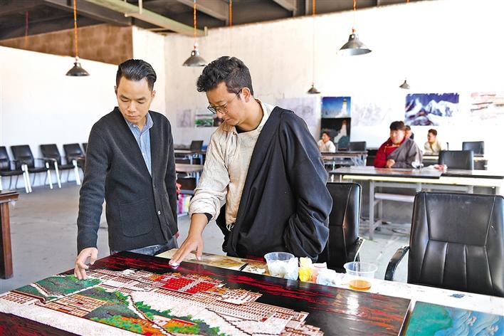 圖為昌都市類扎旦民族文化手工藝工貿(mào)有限公司的技師正在指導學員創(chuàng)作。記者 丹增群培 攝