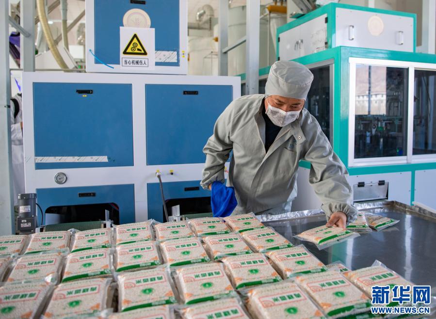 西藏拉薩達孜工業(yè)園區(qū)一家青稞食品生產(chǎn)企業(yè)的工作人員在擺放加工好的青稞產(chǎn)品(2020年2月17日攝)。新華社記者 孫非 攝