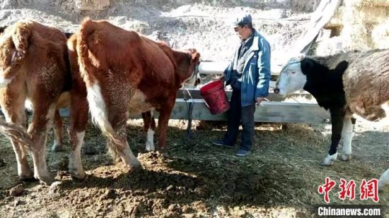 圖為孔繁福正在喂牛。 李雋 攝