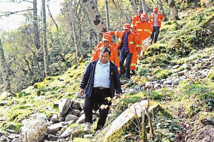 增巴帶領森林巡邏隊在林區(qū)巡山。記者 張斌 陳林 攝