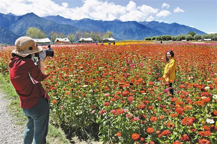 圖為游客在姆多花海內(nèi)拍照留念。記者 張猛 王珊 胡文 攝