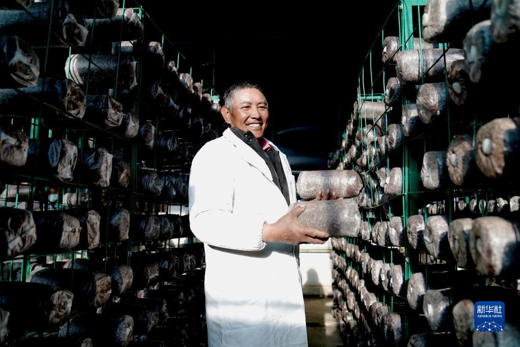 索珠村黨支部書(shū)記洛桑正在擺放菌包(2022年1月24日攝)。 新華社記者劉洪明 攝