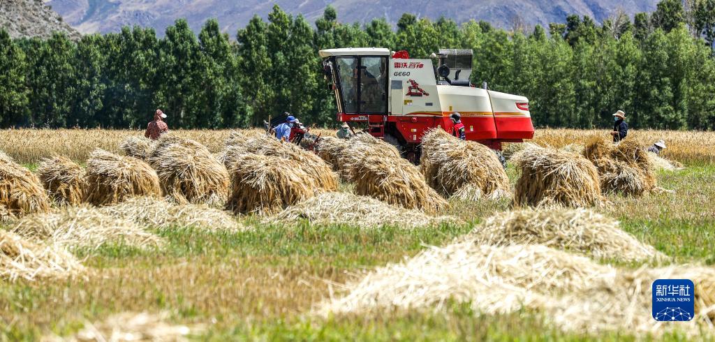 農(nóng)機(jī)合作社和收割工作隊在林周縣邊林鄉(xiāng)當(dāng)杰村玉沖組搶收小麥(9月6日攝)。新華社記者 姜帆 攝