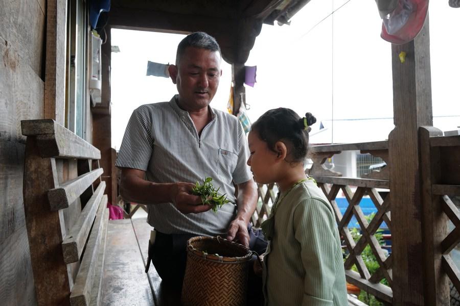 采茶歸來(lái)的向嘎在和外孫女玩耍(2022年6月10日攝)。新華社記者 劉潁 攝