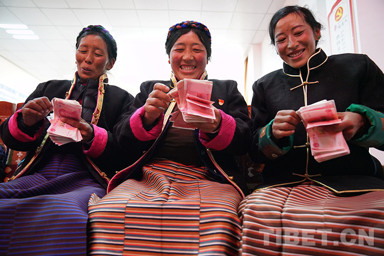 圖為領到工資的部分放牧員家屬正在數錢。攝影:曲杰