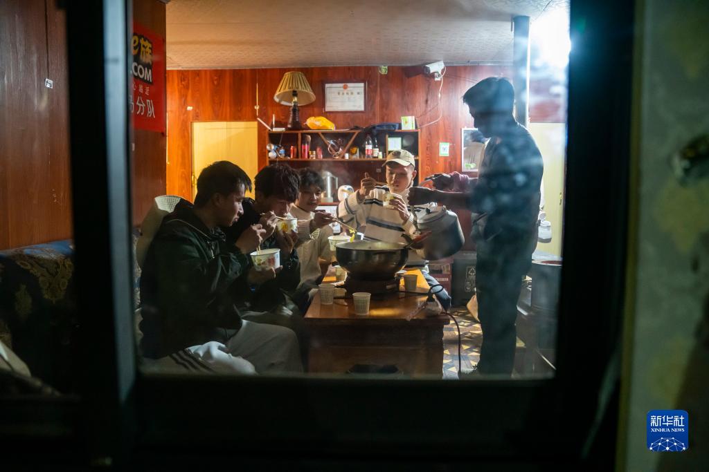 在珠峰游客大本營(yíng)的帳篷旅館里,旦增(右)為客人的牦牛肉湯鍋里加湯料(5月16日攝)。新華社記者 孫非 攝