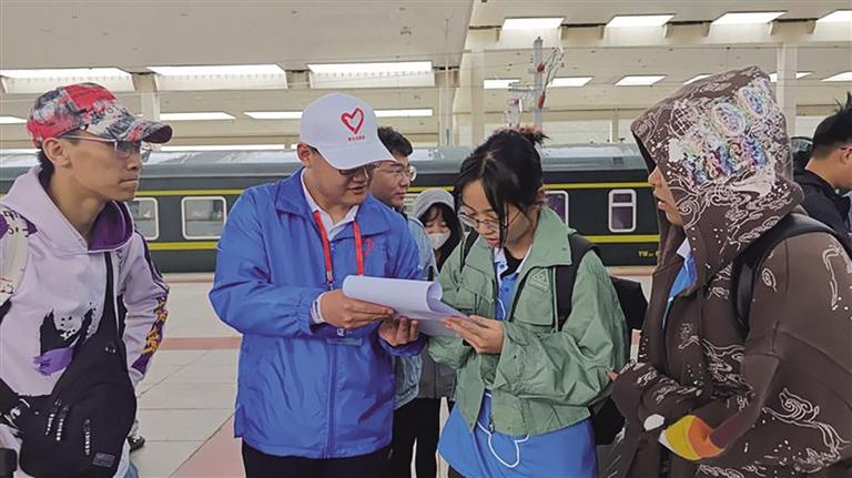 “到西部去、到基層去、到祖國和人民最需要的地方去?!?月24日,2023屆大學(xué)生西部計劃西藏專項志愿者陸續(xù)抵藏報到。現(xiàn)場,共青團西藏自治區(qū)委員會組織了前幾屆志愿者在火車站接站?!拔沂菑暮幽线^來做志愿者的,在西藏已經(jīng)2年了,一直在自治區(qū)經(jīng)信廳上班。今天是過來接學(xué)弟學(xué)妹們的,幫助他們登記報到?!表n義凡說。中午11點左右,火車進站,志愿者們陸續(xù)前來報到?!斑@是我第一次來西藏,還是以志愿者的身份,我會好好工作,為西藏的發(fā)展作出自己的貢獻?!眮碜蕴旖虻奶锟苏f。