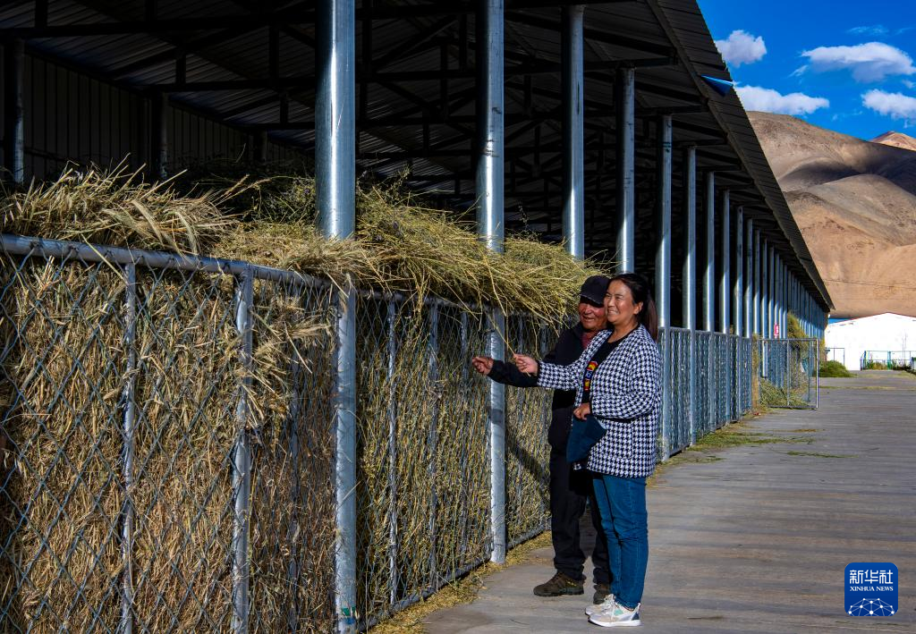 阿里地區(qū)噶爾縣昆莎鄉(xiāng)噶爾新村村民白瑪努桑(左)與地區(qū)農業(yè)農村局草業(yè)工作站工作人員巴桑多吉在查看草棚里晾曬好的紫花苜蓿(9月20日攝)。新華社記者 姜帆 攝