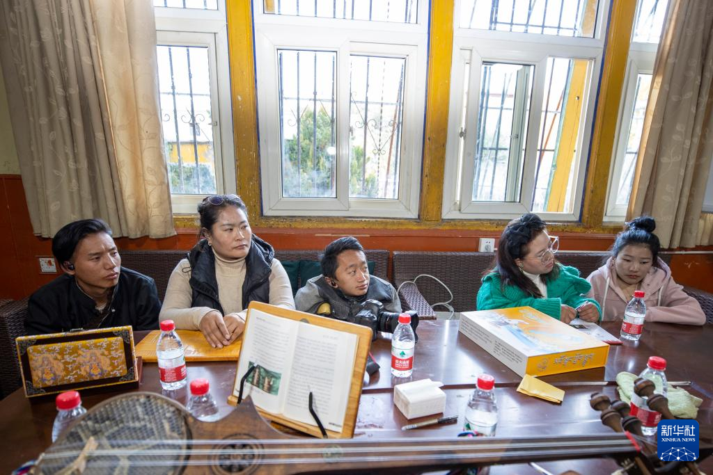 西藏拓崗文化傳播有限公司負責(zé)人覺列(右一)在直播前與直播團隊討論直播方案(11月10日攝)。新華社記者 姜帆 攝