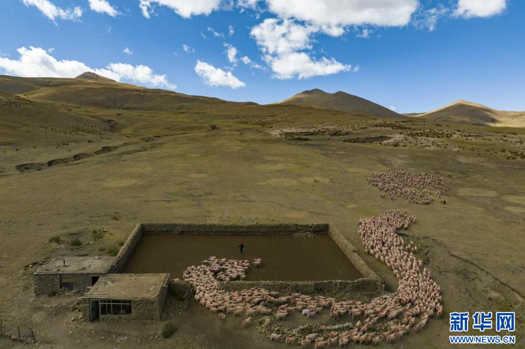扎西松多村集體養(yǎng)殖的千只綿羊(無人機(jī)照片)。新華網(wǎng) 旦增努布 攝