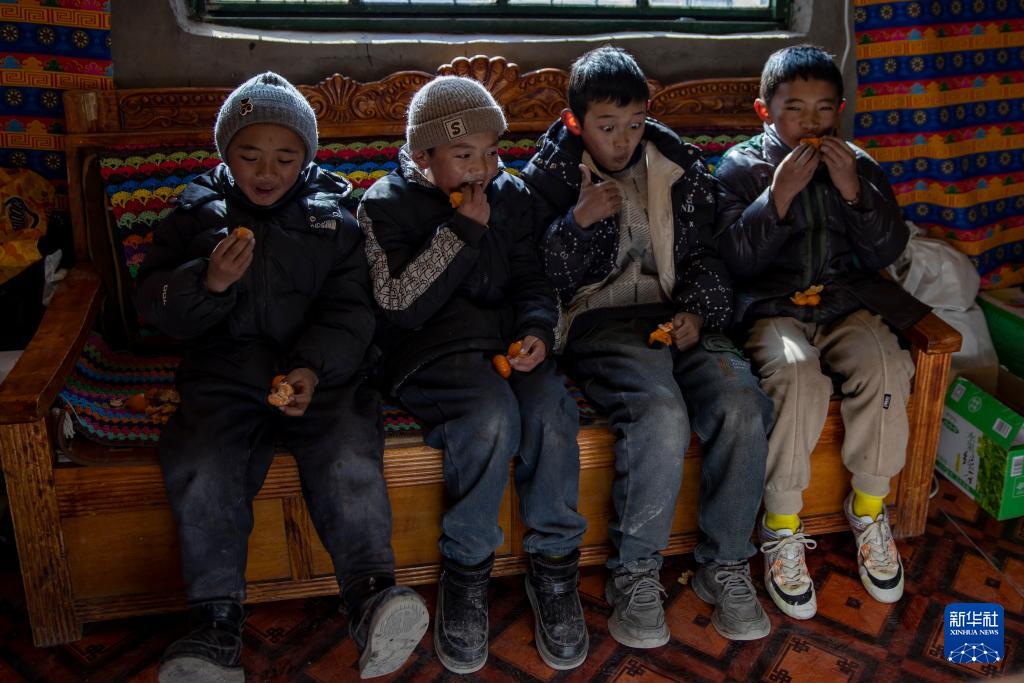 申扎縣馬躍鄉(xiāng)貝嘎四村的幾名小朋友在村里的“偏遠鄉(xiāng)鎮(zhèn)果蔬配送試點項目”直銷點,買來當(dāng)天供銷合作社配送來的新鮮水果品嘗(1月5日攝)。新華社記者姜帆 攝