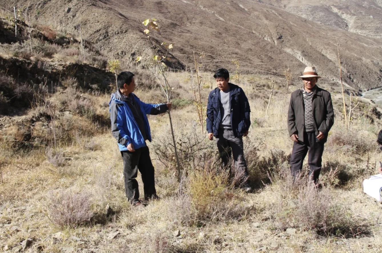 圖為尼瑪次仁(左一)查看樹苗生長情況。(圖片由受訪者本人提供)